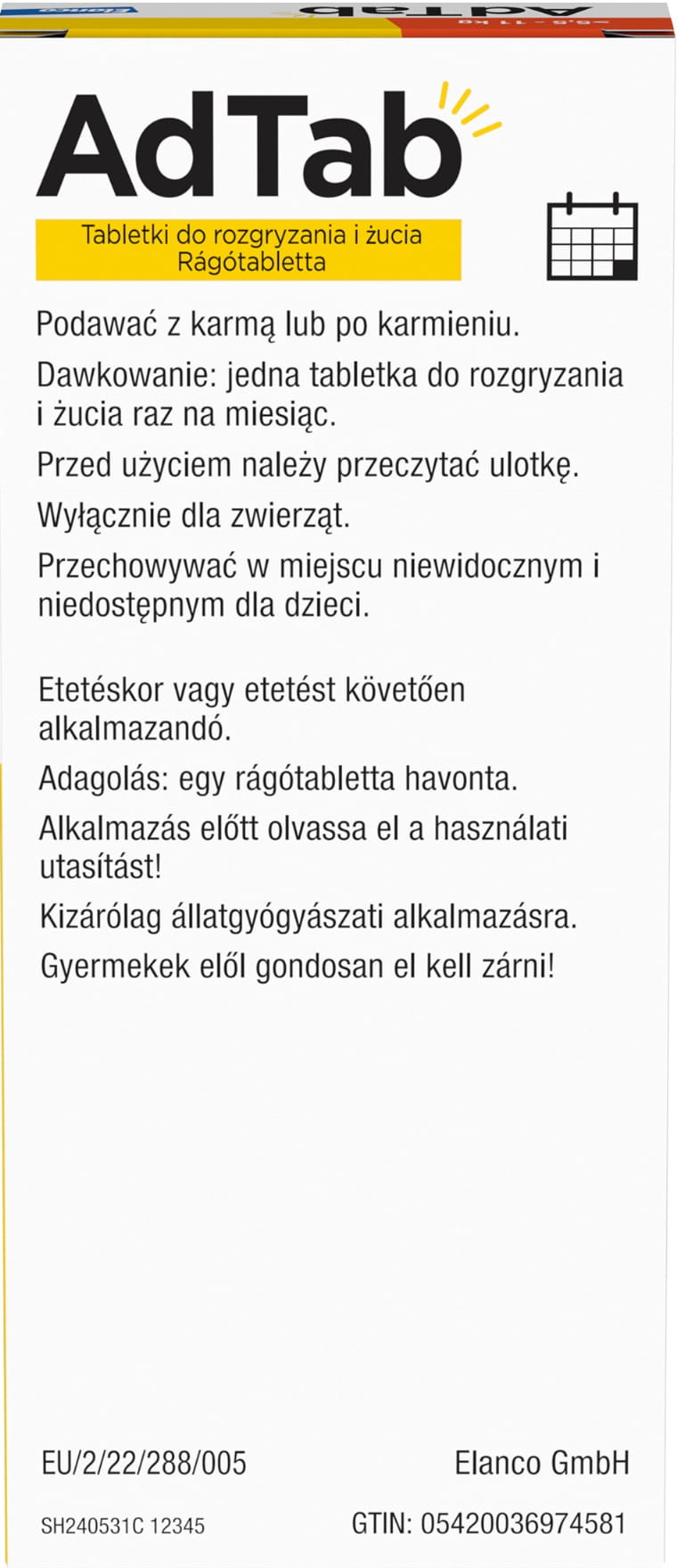 AdTab to tabletki smakowe do rozgryzania i żucia, które łatwo podać psu – wystarczy dodać je do karmy lub podać bezpośrednio po posiłku. Dzięki przyjemnemu smakowi mięsa, tabletki są akceptowane przez większość psów, co znacznie ułatwia proces leczenia i zapobiegania. Produkt działa skutecznie przez 30 dni, więc należy podać go regularnie co miesiąc, aby utrzymać optymalną ochronę przed pasożytami.
