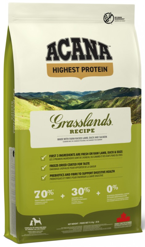 ACANA Highest Protein Grasslands Dog to pełnoporcjowa, bezzbożowa karma sucha klasy premium, stworzona z myślą o naturalnych potrzebach żywieniowych psów. Receptura oparta jest na zasadzie Biologicznie Odpowiedniego Żywienia (Biologically Appropriate™) oraz koncepcji WholePrey, czyli wykorzystania całych zdobyczy zwierzęcych w idealnych proporcjach.
