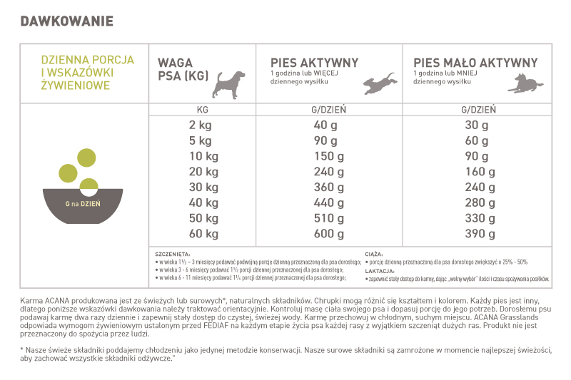 Karma wyróżnia się bardzo wysoką zawartością białka oraz wyjątkową różnorodnością mięs i ryb, które trafiają do kuchni NorthStar® codziennie w postaci świeżej lub surowej. Dzięki temu ACANA Grasslands doskonale wspiera kondycję, siłę i zdrowie psów wszystkich ras i w każdym wieku (z wyjątkiem psów ras dużych w okresie wzrostu).
