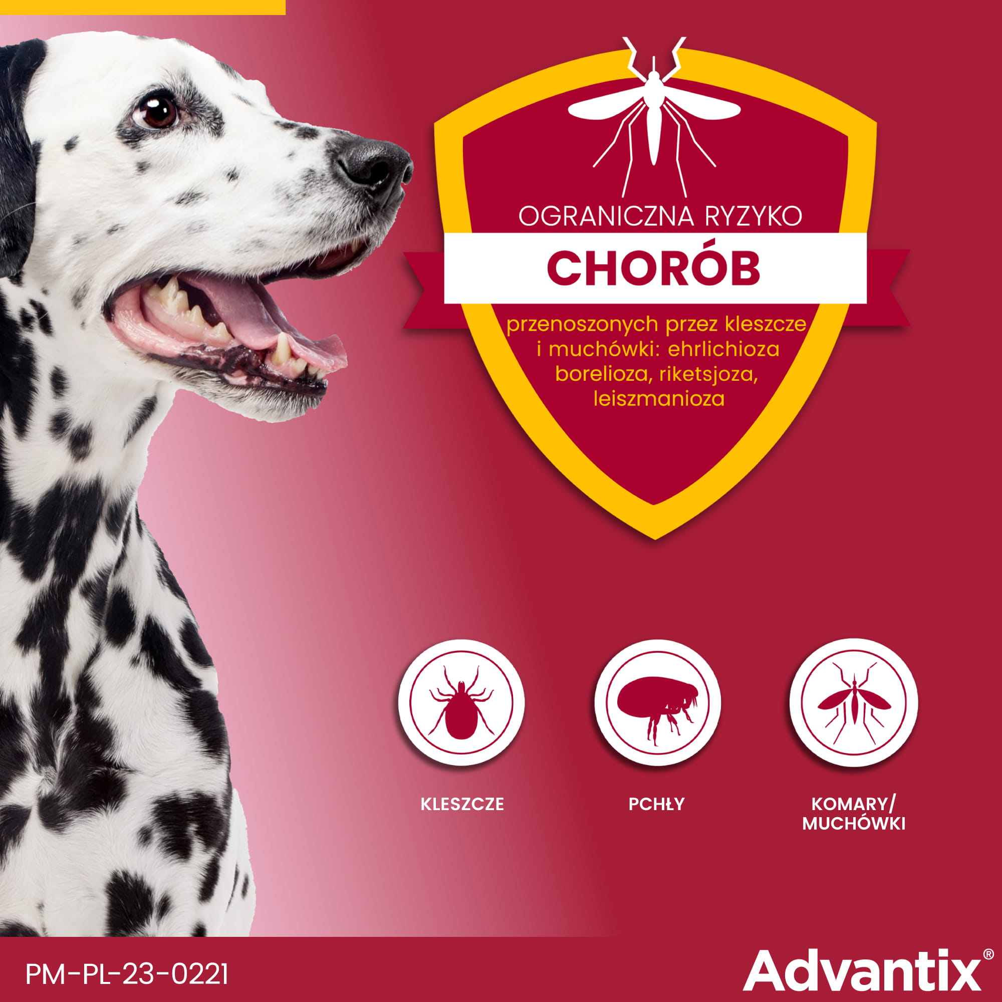 Komary i meszki: Advantix odstrasza te owady przez okres 4 tygodni, zmniejszając ryzyko zarażenia chorobami, takimi jak leiszmanioza.