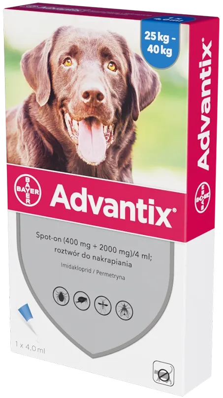 Advantix Spot-On dla psów o wadze od 25kg do 40kg to niezastąpione narzędzie w walce z pasożytami, które zapewnia skuteczną ochronę przed pchłami, kleszczami oraz komarami przez okres czterech tygodni. Jego łatwa aplikacja, długotrwała ochrona i szeroki zakres działania sprawiają, że jest to jeden z najczęściej wybieranych produktów dla psów narażonych na kontakt z pasożytami zewnętrznymi. Jeśli zależy Ci na zdrowiu swojego pupila i chcesz zapewnić mu komfort bez obaw o zagrożenia związane z chorobami przenoszonymi przez pasożyty.