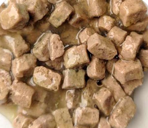 Skład: 76% składników pochodzenia zwierzęcego, w kawałkach (mięso i produkty pochodzenia zwierzęcego, w tym: 25% kurczak), ryby i produkty pochodzenia rybnego (w tym: 27% łosoś)), bulion, mąka ryżowa, gluten pszenny, celuloza, zioła 0,1% (tymianek, szałwia, pietruszka, oregano).
