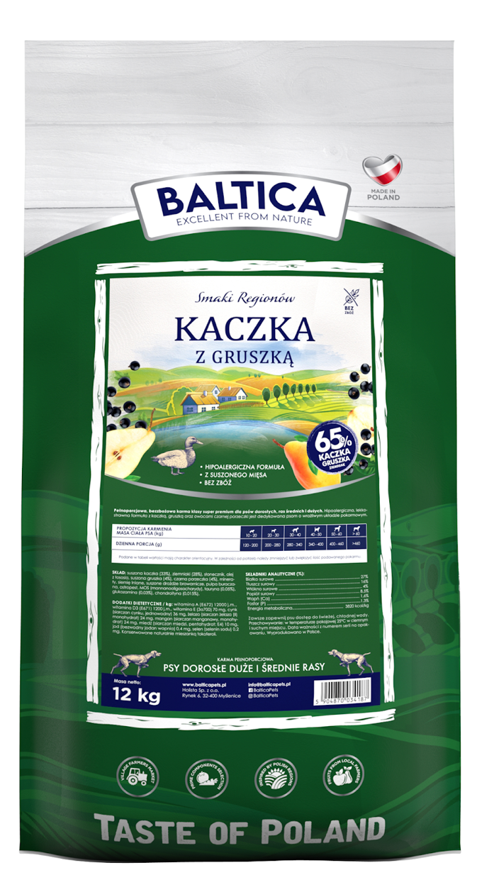 Baltica Kaczka z Gruszką to bezzbożowa, pełnoporcjowa karma klasy super premium, zaprojektowana z myślą o psach, zarówno o normalnej, jak i wzmożonej aktywności. Jest to wyjątkowa kompozycja, której głównym składnikiem jest najwyższej jakości suszone mięso kaczki, wzbogacone o naturalne dodatki w postaci polskiej gruszki i czarnej porzeczki.