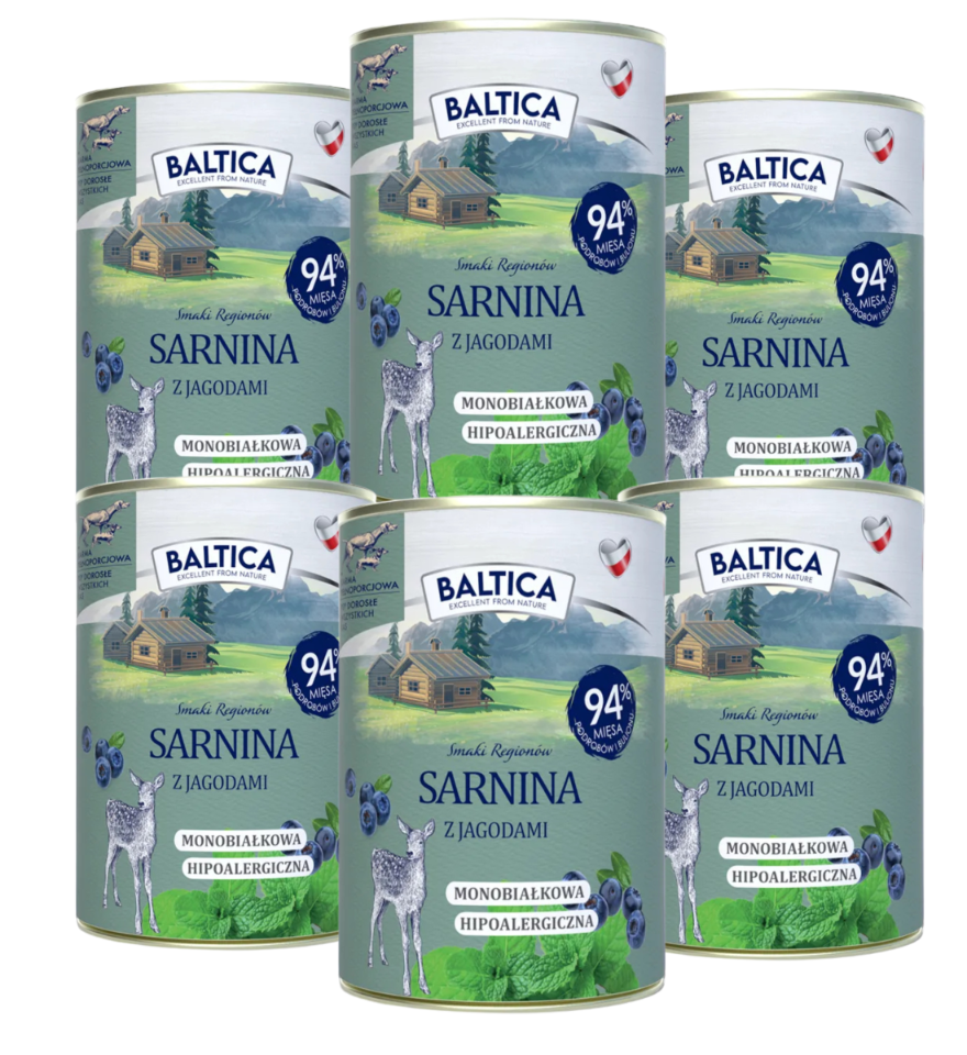 Baltica sarnina z jeżyną to bezzbożowa, monoproteinowa karma mokra, stworzona specjalnie dla dorosłych psów, które potrzebują delikatnego, ale pełnowartościowego żywienia. Dzięki wyłącznie jednemu źródłu białka – mięsu sarny – karma minimalizuje ryzyko alergii i nietolerancji pokarmowych. Jagody i mięta wspierają układ trawienny, poprawiając komfort psa po posiłku, oraz działają antyoksydacyjnie, chroniąc organizm przed stresem oksydacyjnym. Karma jest doskonałym rozwiązaniem dla psów o wrażliwym żołądku, skłonnych do alergii, lub tych, które potrzebują lekkostrawnej diety opartej na jednym źródle białka.