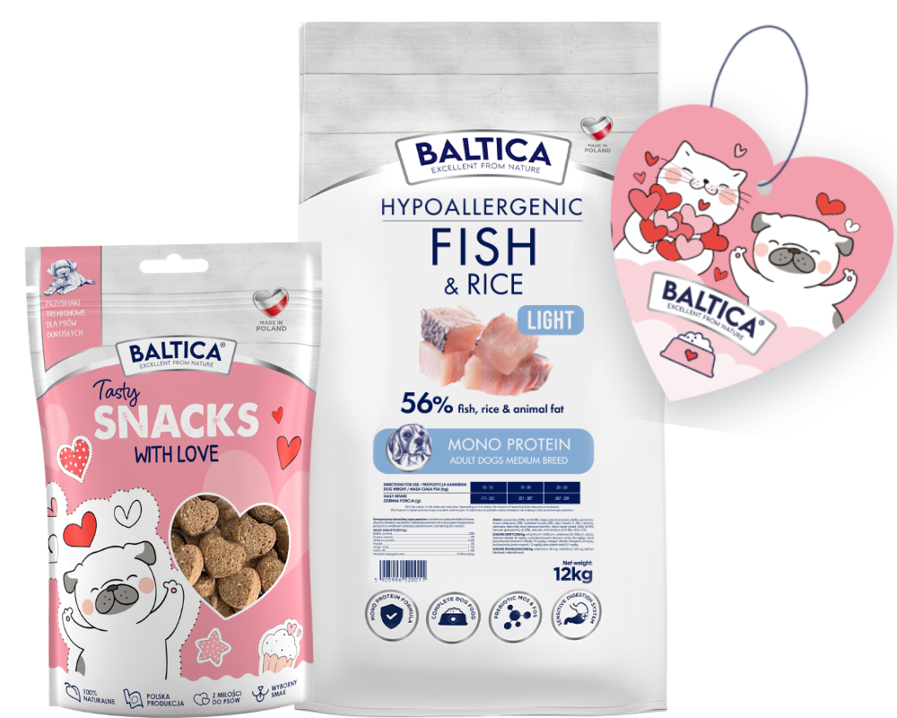 Baltica Monoprotein Adult Light Fish Rice M 12kg + Przysmak i zapach do samochodu