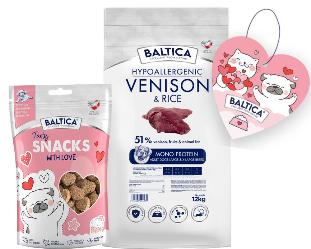 Baltica Monoprotein Adult Venison Rice L/XL 12kg + Przysmak i zapach do samochodu
