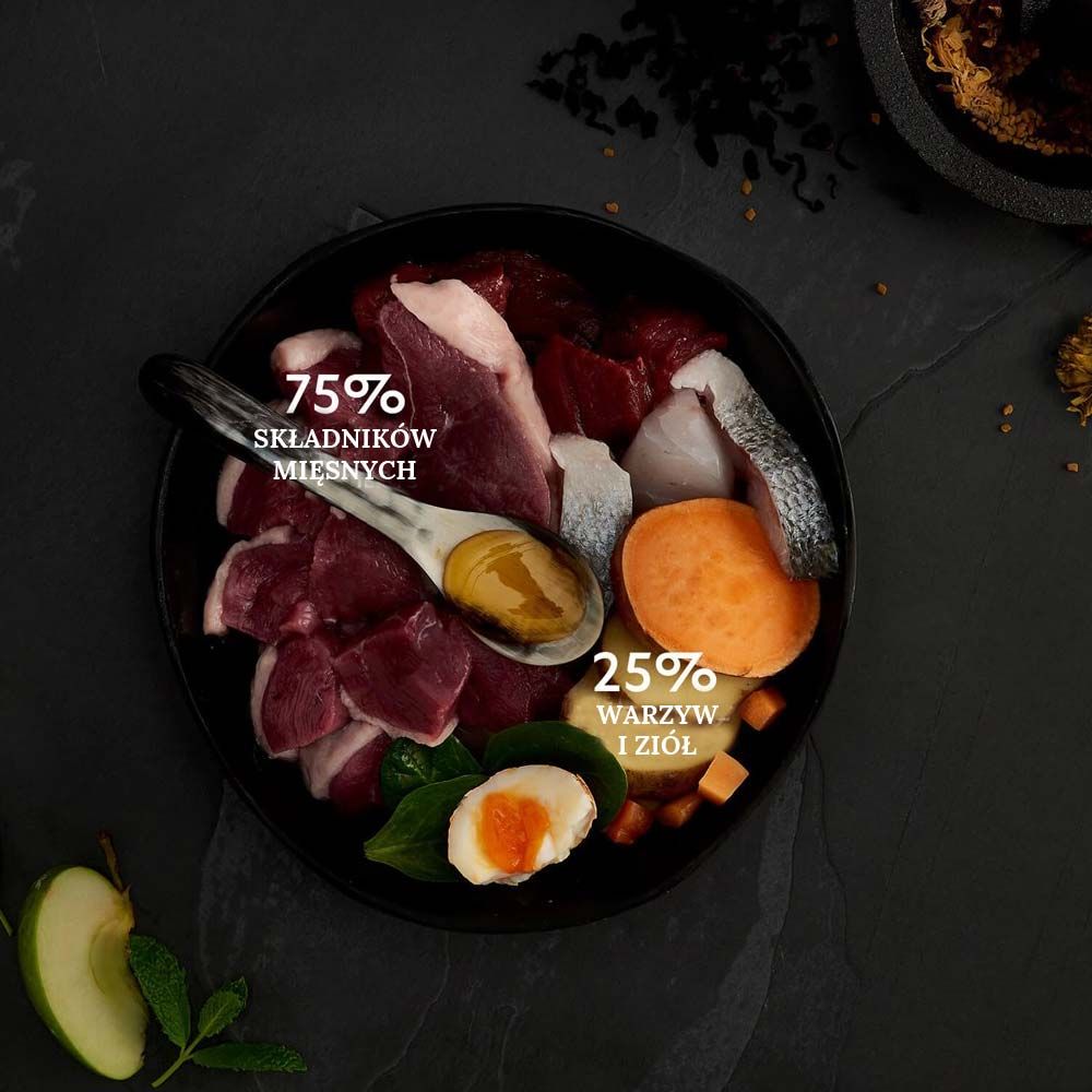 Skład: Świeże mięso z kaczki bez kości (44%), suszona kaczka (10%), bataty, ziemniaki, świeża sarnina bez kości (7%), suszony śledź (6%), suszone mięso z królika (4%), białko grochu, suszone jaja ( 2%), wywar z kurczaka (1%), lucerna, olej z łososia (1%), białko ziemniaczane, minerały, witaminy, żurawina, mannanoligosacharydy, fruktooligosacharydy, jabłko, marchew, szpinak, wodorosty, rumianek, mięta pieprzowa, nagietek, anyż i kozieradka pospolita.