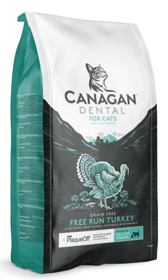 Canagan Dental Free Run Turkey to bezzbożowa karma dla kotów, oparta na świeżym mięsie indyka i kurczaka, wzbogacona o warzywa oraz starannie dobrane zioła. Receptura została opracowana z myślą o codziennym wsparciu zdrowia jamy ustnej. Karma zawiera ProDenPlaqueOff® - opatentowany dodatek pozyskiwany ze specjalnego gatunku wodorostów morskich z rejonu Północnego Atlantyku. Składnik ten działa od wewnątrz, poprzez układ krwionośny, wspierając naturalne mechanizmy śliny odpowiedzialne za ograniczanie odkładania się płytki nazębnej i kamienia.
