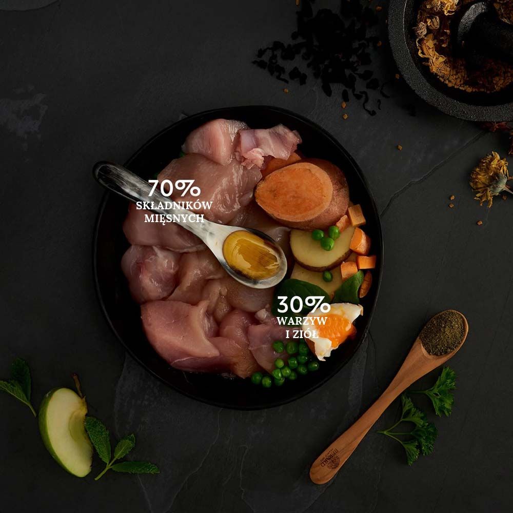 - świeże mięso indyka i kurczaka jako główne źródło białka