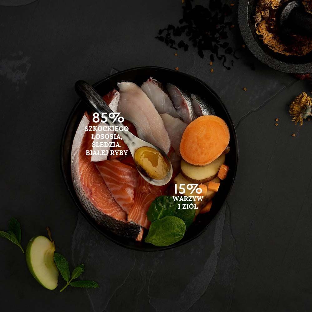 Skład: świeży szkocki łosoś bez ości (31%), bataty, suszone śledzie (12%), suszony szkocki łosoś (11%), ziemniaki, olej z łososia (8,1%), suszone białe ryby (6,5%), świeży pstrąg (4,65), salmon stock (2,3%), minerały, witaminy, lucerna, żurawina, mannaoligosacharydy, fruktooligosachrydy, jabłko, marchew, szpinak, wodorosty, rumianek, mięta pieprzowa, nagietek, anyż i kozieradki.