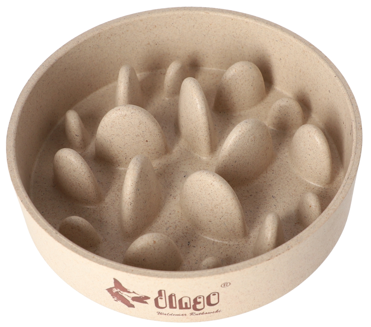 Miski spowalniające jedzenie wykonane są z naturalnego i ekologicznego tworzywa bambusowego. Dedykowane są psom, które zbyt szybko i łapczywie jedzą. Posiadają specjalne wypustki, które uniemożliwiają psu za szybkie zjadanie pokarmu. W efekcie jest wydłużamy psu czas jedzenia poprzez zmniejszenie ilości połykanej porcji karmy. Zwierzę, które je zbyt szybko, nie gryzie pokarmu lub go łapczywie połyka. Pochłania przy tym bardzo dużo powietrza, co często skutkuje problemami gastrycznymi. Miski spowalniające jedzenie pomagają nam wyeliminować ten problem. Dzięki nieco skomplikowanemu procesowi wydobywania karmy spośród zakamarków miski, pies uspokaja się, a także wyładowuje zapasy energii.
