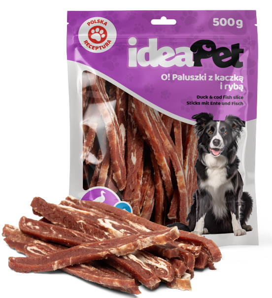 IdeaPet Paluszki z kaczką i dorszem zawierają 65,9% mięsa z kaczki oraz 25% dorsza, co sprawia, że stanowią smaczną i pełną białka przekąskę. Mięso z kaczki wspomaga rozwój masy mięśniowej i dostarcza niezbędnych tłuszczy, natomiast dorsz bogaty jest w kwasy tłuszczowe Omega-3, które pozytywnie wpływają na kondycję skóry i sierści. Paluszki mają ergonomiczny kształt, idealny do żucia, co sprawia, że świetnie sprawdzają się jako nagroda lub smaczna przekąska pomiędzy posiłkami. Jest to pokarm uzupełniający, który nie zastępuje pełnowartościowej diety. Przysmaki nie powinny stanowić więcej niż 10%-15% dziennego zapotrzebowania kalorycznego psa. Należy pamiętać o zapewnieniu dostępu do świeżej wody przez cały dzień.