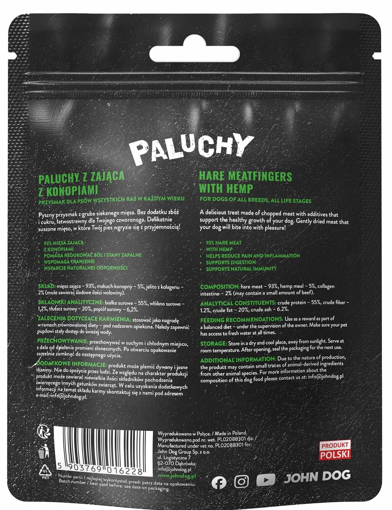 JohnDog Paluchy z zająca z konopiami – przysmak, który nie tylko zaspokoi potrzebę żucia, ale również dostarczy Twojemu pupilowi mnóstwo frajdy! To doskonały wybór dla psów w każdym wieku – zarówno dla młodych, pełnych energii szczeniaków, jak i starszych psów, które zasługują na zdrowy smakołyk. Dzięki kompaktowej formie świetnie sprawdza się podczas spacerów – bez problemu mieści się w kieszeni, więc zawsze możesz mieć go pod ręką jako pyszną nagrodę w trakcie wspólnej aktywności. Pokrojony na cienkie plasterki, doskonale nadaje się do treningów – jego wyjątkowy smak zmotywuje nawet najbardziej rozproszonego czworonoga. Produkt jest w pełni naturalny – nie zawiera sztucznych barwników, konserwantów ani dodatków zapachowych.