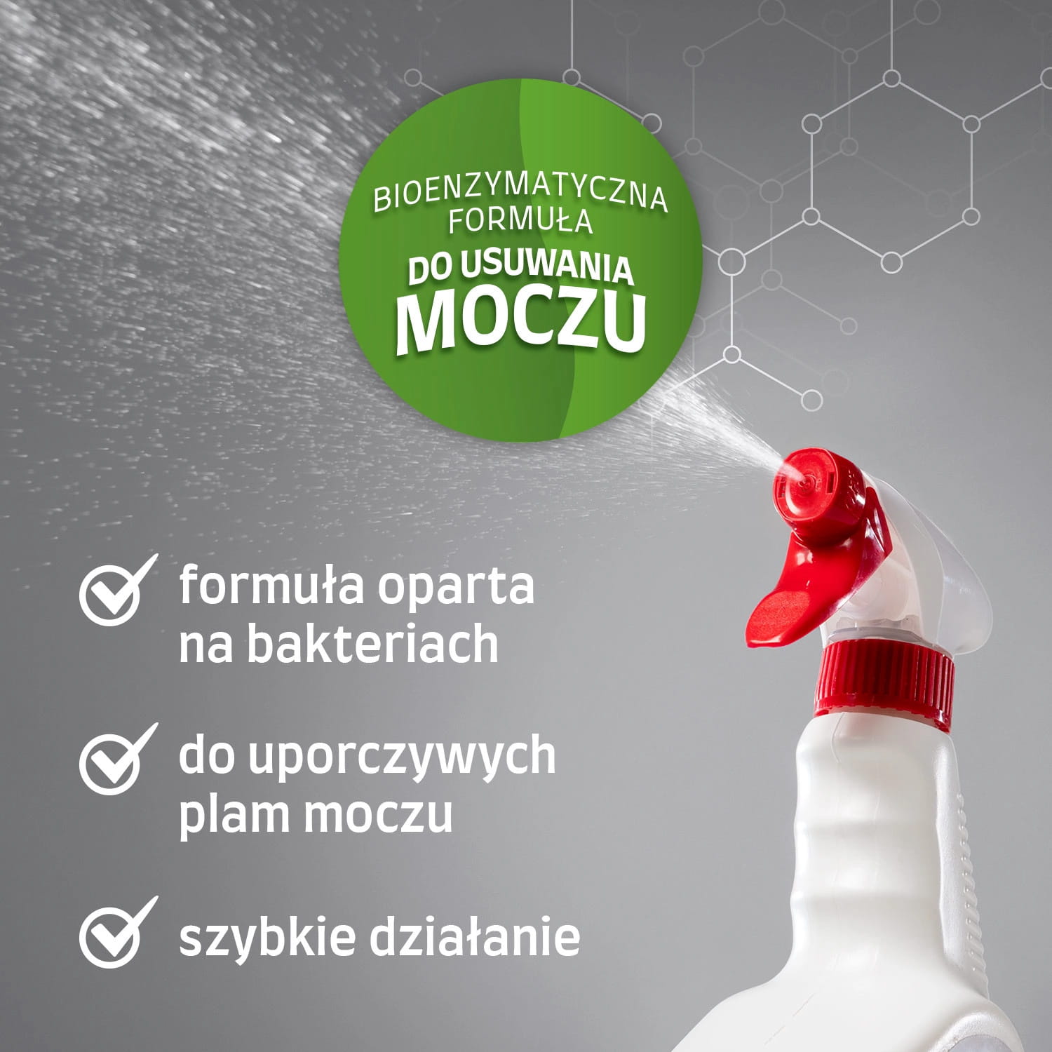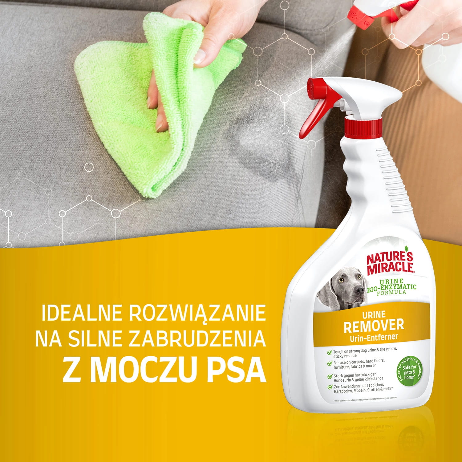 Sposób użycia: Przed użyciem sprawdź czyszczoną powierzchnię pod kątem trwałości koloru, nakładając preparat na mniej widoczny obszar. Odczekaj 5 minut, a następnie zetrzyj preparat bawełnianą ściereczką. Jeśli na obszarze testowym kolor zniknie, nie używaj produktu Nature’s Miracle® Urine Remover Dog na danej powierzchni. Nie zalecamy stosowania produktu na surowym drewnie, skórze, zamszu, jedwabiu i wełnie, porowatych powierzchniach kamiennych i ceramicznych. Zawsze użyj najpierw produktu Nature’s Miracle® Urine Remover Dog. Inne środki czyszczące i detergenty mogą się nie sprawdzić i chemicznie „utrwalić” plamy, których nie będzie można potem usunąć. Usuwanie plam i nieprzyjemnych zapachów: oczyść jak najlepiej zabrudzenie, a następnie dokładnie namocz zabrudzony obszar preparatem. Namaczanie jest ważne, bo dzięki temu środek może wniknąć głębiej. Pozostaw na 15 minut, a następnie osusz plamę czystą ściereczką. Trudne plamy: delikatnie wyszoruj obszar plamy, zanim użyjesz środka i pozostawisz go na 15 minut. Silne zapachy: ponownie namocz cały zabrudzony obszar i pozostaw do wyschnięcia.