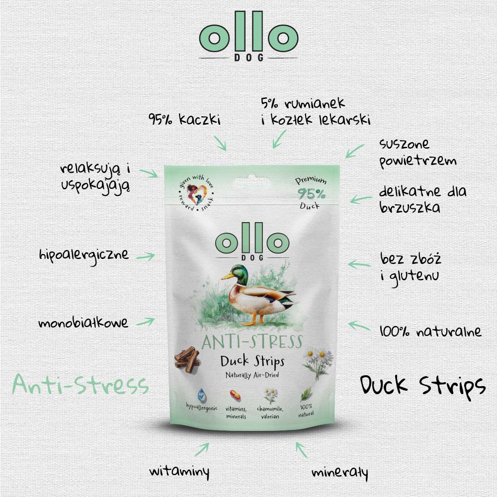 Ollo Air Dried Anti-Stress Duck Strips to idealne rozwiązanie dla właścicieli psów, którzy chcą zadbać o dobre samopoczucie swojego czworonoga. Te wyjątkowe paski z kaczki, suszone powietrzem, to nie tylko zdrowa przekąska – to także wsparcie w redukcji codziennego stresu i napięcia u psa. To naturalne, monobiałkowe przysmaki z kaczki, stworzone z myślą o psach potrzebujących wsparcia w stresujących sytuacjach. Zawierają rumianek i kozłek lekarski, które pomagają w wyciszeniu, relaksie i spokojnym śnie. Idealne podczas burz, wizyt u weterynarza czy chwil lęku. Dzięki delikatnemu suszeniu powietrzem, smakołyki zachowują pełnię wartości odżywczych i są wyjątkowo smakowite. Miękka konsystencja ułatwia dzielenie ich na mniejsze kawałki – świetne na co dzień i do nagradzania. To nie zwykłe przysmaki, lecz funkcyjne przekąski – wzbogacone o zioła i składniki wspierające zdrowie i samopoczucie psa. Smaczne, zdrowe i pomocne w codziennej opiece nad pupilem.