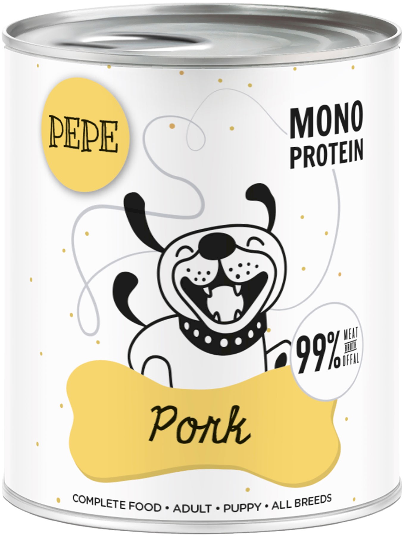 Paka Zwierzaka Pepe Pork – pełnowartościowa, naturalna karma mokra oparta w 100% na wieprzowinie. To idealna propozycja dla psów w każdym wieku – również dla szczeniąt i pupili z wrażliwym układem trawiennym. Monobiałkowa receptura wspiera zdrowie jelit, odporność i zapewnia wyjątkowy smak każdego dnia. Każda puszka zawiera aż 99% mięsa, podrobów i rosołu z wieprzowiny – bez zbędnych dodatków, zbóż, konserwantów czy sztucznych barwników. Wieprzowina to lekkostrawne mięso o wysokiej wartości biologicznej – źródło białka, witamin z grupy B, cynku i selenu, niezbędnych dla odporności i układu nerwowego psa.