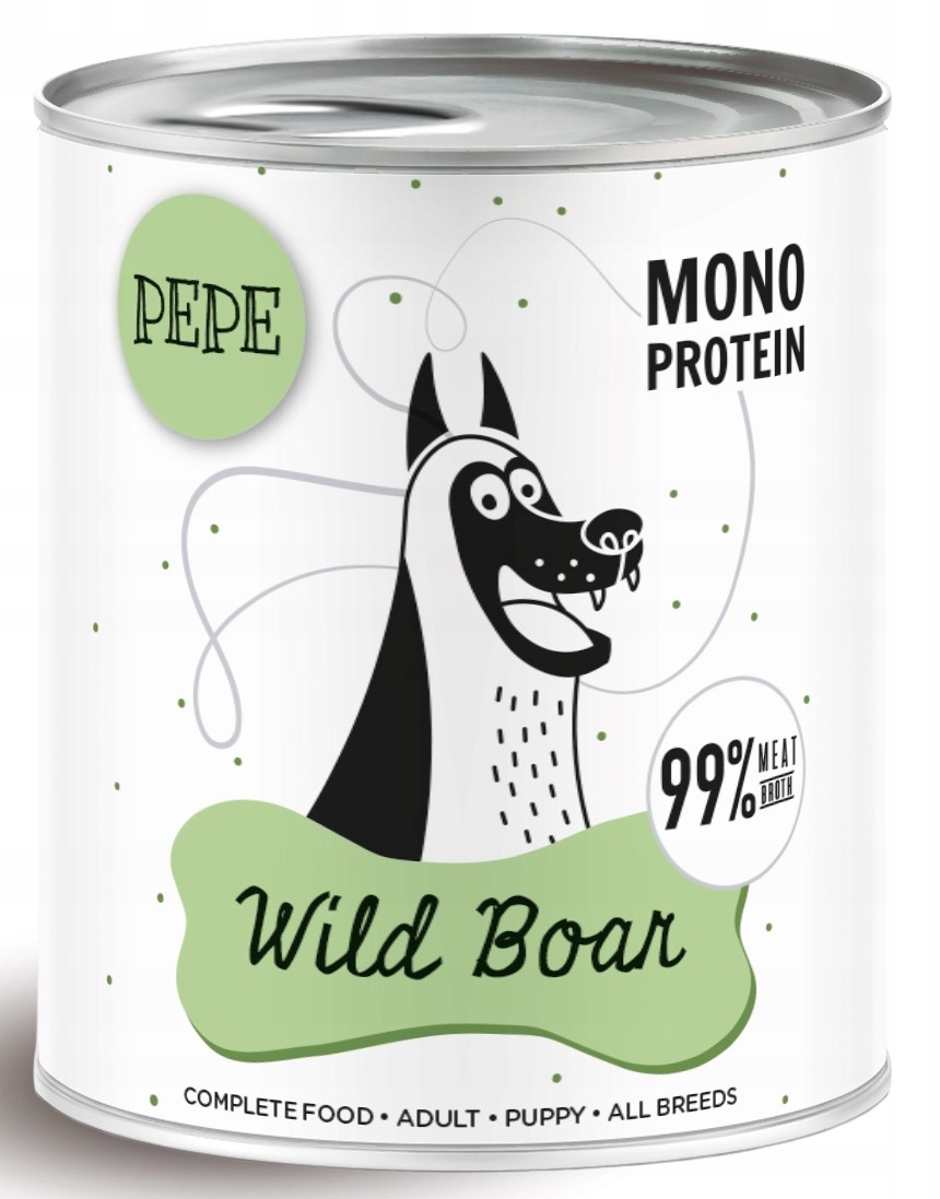 Paka Zwierzaka Pepe Wild Boar - wysokiej jakości, pełnoporcjowa karma mokra na bazie mięsa z dzika. To idealna opcja dla psów w każdym wieku – również szczeniąt i psów o wrażliwym układzie trawiennym. Dziczyzna to źródło cennych składników wspierających odporność, zdrową masę ciała i codzienną witalność. Każda puszka zawiera aż 99% mięsa, podrobów i naturalnego rosołu z dzika. Bez zbóż, konserwantów, barwników i chemii. Dziczyzna to chude, dobrze przyswajalne mięso, bogate w białko, żelazo, fosfor i witaminy z grupy B – idealne dla zdrowia i energii psa.