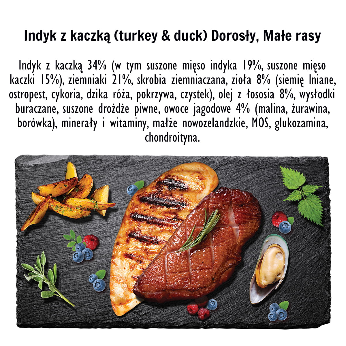 Skład: Kaczka i łosoś 42% ( w tym suszone mięso kaczki 22%, suszony łosoś 12%, olej z łososia 8%), ziemniaki 19%, skrobia ziemniaczana, zioła 11% (siemię lniane, ostropest, lucerna, szałwia, cykoria, dzika róża, pokrzywa, czystek), wysłodki buraczane, suszone drożdze piwne, marchewka, jabłko, minerały i witaminy, małże nowozelandzkie, MOS, glukozamina, chondroityna.