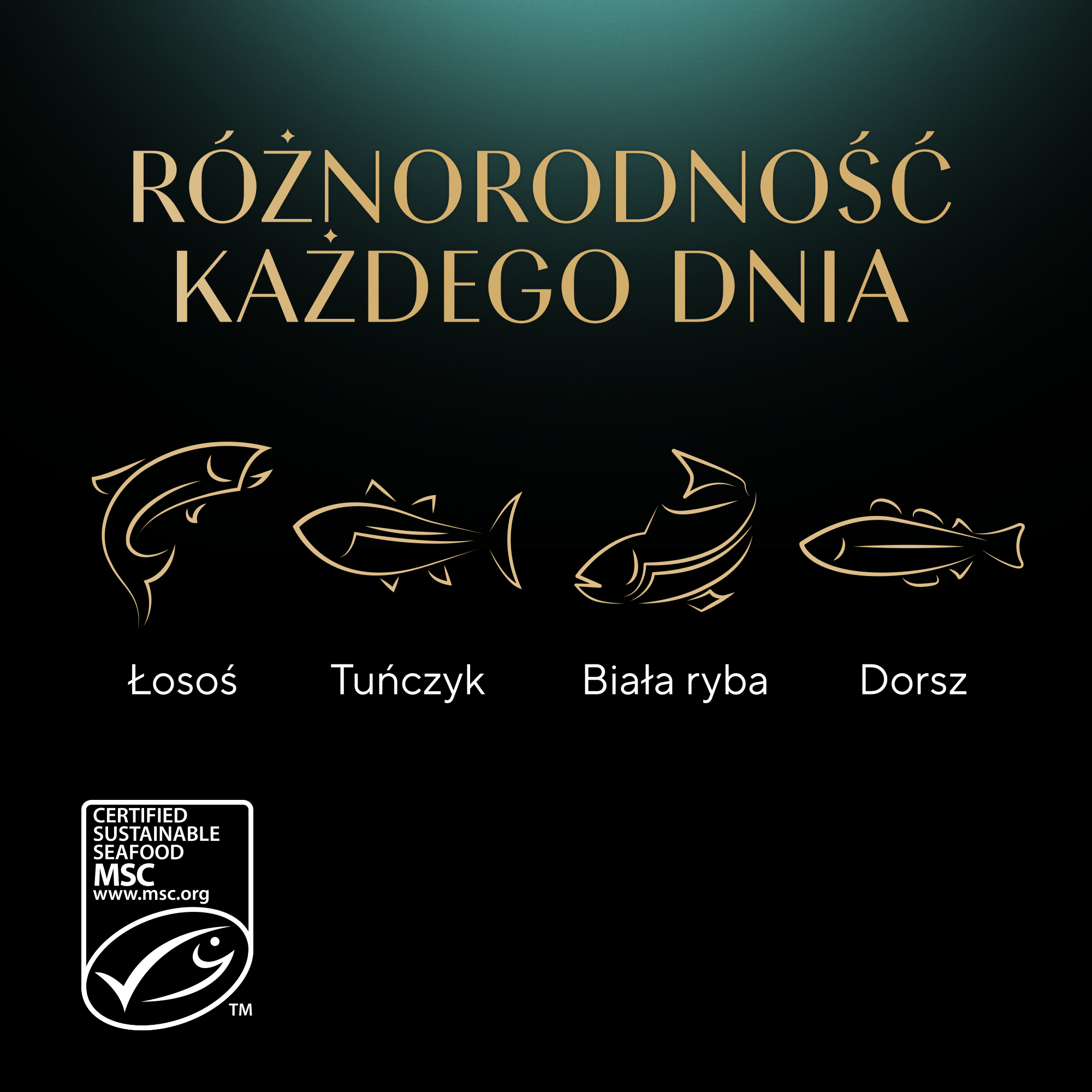 - Karma dla dorosłego kota z pysznym zestawem smaków: dorsz, łosoś, tuńczyk i białe ryby w galaretce.