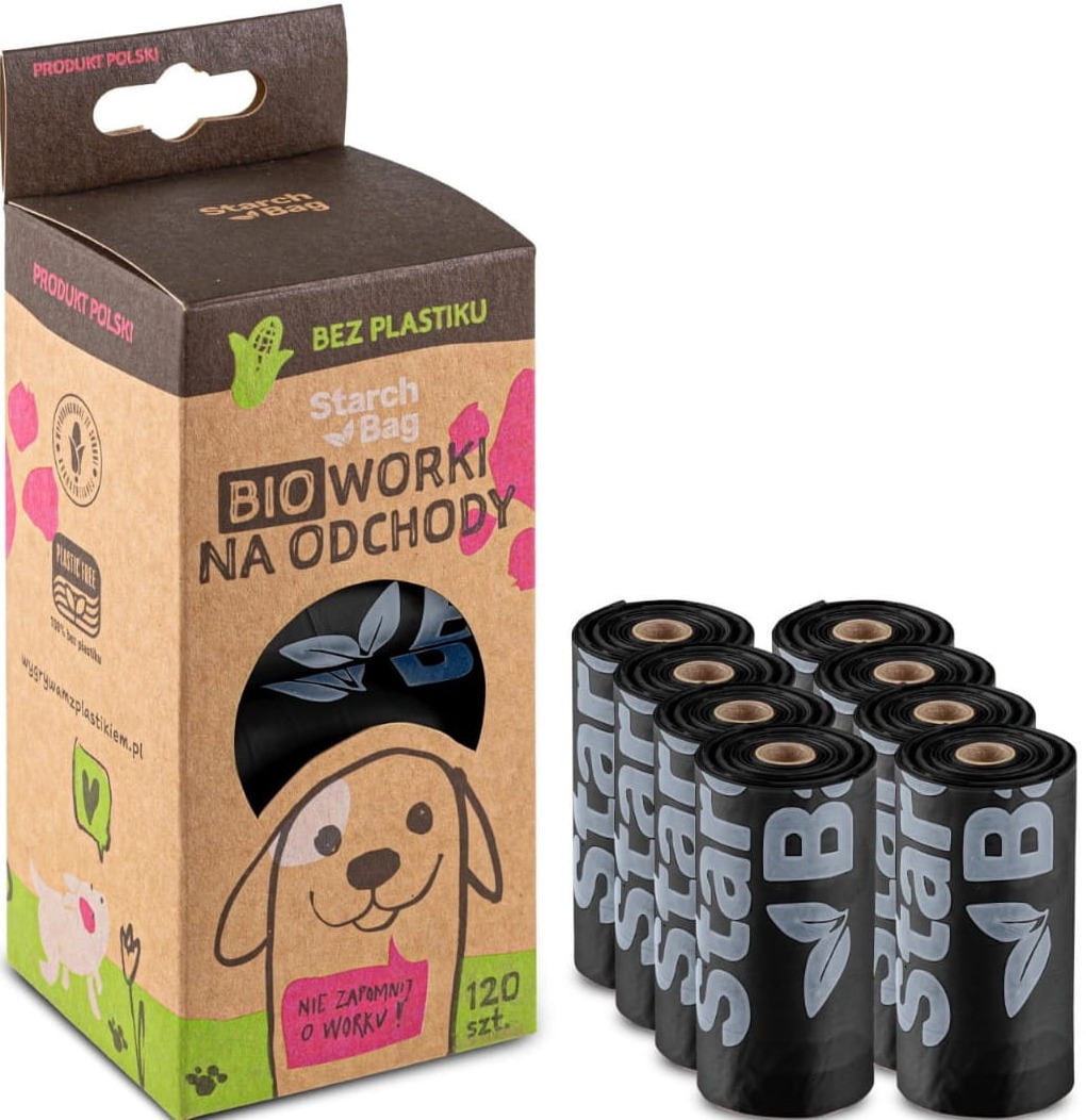BIOworki na odchody marki StarchBag™ to w pełni biodegradowalne i kompostowalne woreczki, które są przyjazne dla środowiska. Wykonane z biopolimeru opartego na skrobi kukurydzianej, nie zawierają plastiku i ulegają całkowitej biodegradacji w biomasę w ciągu zaledwie 40 dni, nie pozostawiając mikroplastiku. Biopolimer użyty w produkcji worków StarchBag posiada certyfikat OK compost HOME®, co potwierdza ich zdolność do pełnej biodegradacji w warunkach domowego kompostowania. Woreczki StarchBag wyróżniają się swoją gładką i przyjemną fakturą, nie szeleszczą i są łatwe w użyciu, przewyższając pod tym względem plastikowe, oksydegradowalne czy częściowo kompostowalne odpowiedniki. Wytrzymałe i odporne. Pewna ochrona przed nieprzyjemnymi zapachami. Na worku znajduje się znacznik pomagający znaleźć koniec worka. Worki bardzo łatwo otworzyć, folia w przeciwieństwie do plastikowej się nie skleja!