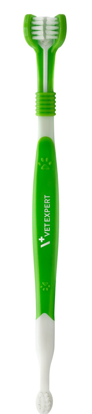 Vet Expert Caryodent szczoteczka do zębów to nowoczesne rozwiązanie stworzone z myślą o skutecznej i bezpiecznej higienie jamy ustnej psa. Dzięki miękkiemu włosiu o odpowiedniej długości delikatnie usuwa osad, nie powodując podrażnień dziąseł. Trójstronna konstrukcja główki została zaprojektowana tak, aby dokładnie dopasować się do kształtu zębów i jednocześnie czyścić ich powierzchnie z różnych stron. Dodatkowa, mniejsza końcówka umożliwia dotarcie do trudno dostępnych miejsc, co zapewnia jeszcze dokładniejsze czyszczenie. Całość uzupełnia wygodna, antypoślizgowa rączka, która gwarantuje pewny chwyt podczas codziennej pielęgnacji.