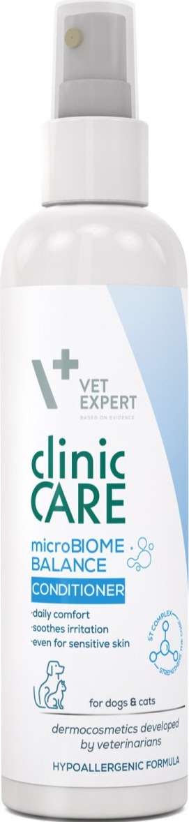 Vet Expert Clinic Care Microbiome Balance Odżywka to specjalistyczny preparat stworzony z myślą o psach i kotach z wrażliwą skórą, zaburzoną równowagą mikrobiomu lub skłonnościami do podrażnień. Jej zaawansowana formuła wspiera naturalną florę bakteryjną skóry, jednocześnie intensywnie odżywiając i wzmacniając sierść. Zawarty ST COMPLEX (kompleks witaminowo-peptydowy) poprawia kondycję sierści i ułatwia jej rozczesywanie, a pre- i postbiotyki (GOS, FOS, Lactobacillus) wspierają odbudowę naturalnej mikroflory skóry i przywracają jej biologiczną równowagę. Dodatek ekstraktu z baobabu intensywnie nawilża i chroni sierść przed uszkodzeniami wywołanymi przez czynniki zewnętrzne.