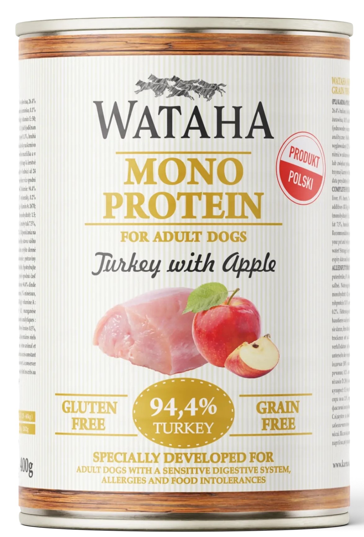 Wataha Mono Indyk Jabłko to pełnoporcjowa mokra karma przeznaczona dla dorosłych psów, szczególnie tych z wrażliwym układem pokarmowym lub skłonnością do alergii i nietolerancji pokarmowych. Receptura oparta jest na jednym źródle białka zwierzęcego – mięsie z indyka, które dostarcza wartościowych aminokwasów potrzebnych do prawidłowego funkcjonowania organizmu psa. Dodatek jabłka wzbogaca karmę o naturalne składniki roślinne oraz nadaje jej przyjemny smak i aromat, który chętnie akceptują nawet wybredne psy. Karma nie zawiera zbóż, glutenu ani soi, dzięki czemu jest odpowiednia dla psów o wrażliwym układzie trawiennym.