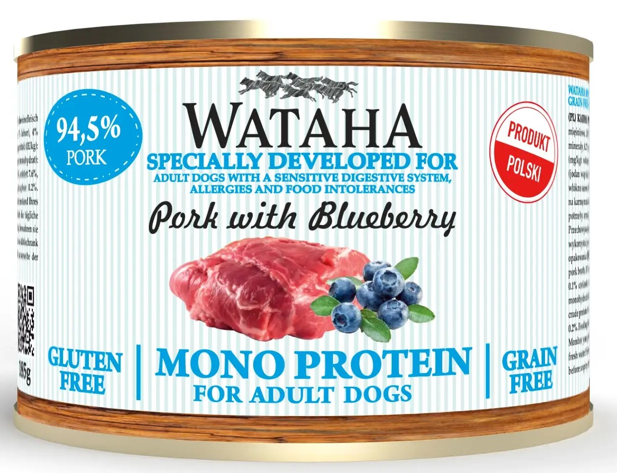 Wataha Mono Wieprzowina Borówka to pełnoporcjowa mokra karma przeznaczona dla dorosłych psów, szczególnie tych z wrażliwym układem trawiennym lub skłonnością do alergii pokarmowych. Dzięki prostej, monobiałkowej recepturze posiłek jest łatwiej przyswajalny i delikatny dla przewodu pokarmowego. Podstawą karmy jest wysokiej jakości wieprzowina, która dostarcza wartościowego białka i niezbędnych składników odżywczych. Dodatek borówki amerykańskiej wzbogaca recepturę o naturalne antyoksydanty wspierające odporność psa. Produkt nie zawiera zbóż, glutenu ani soi, dzięki czemu dobrze sprawdzi się u psów z wrażliwościami pokarmowymi.
