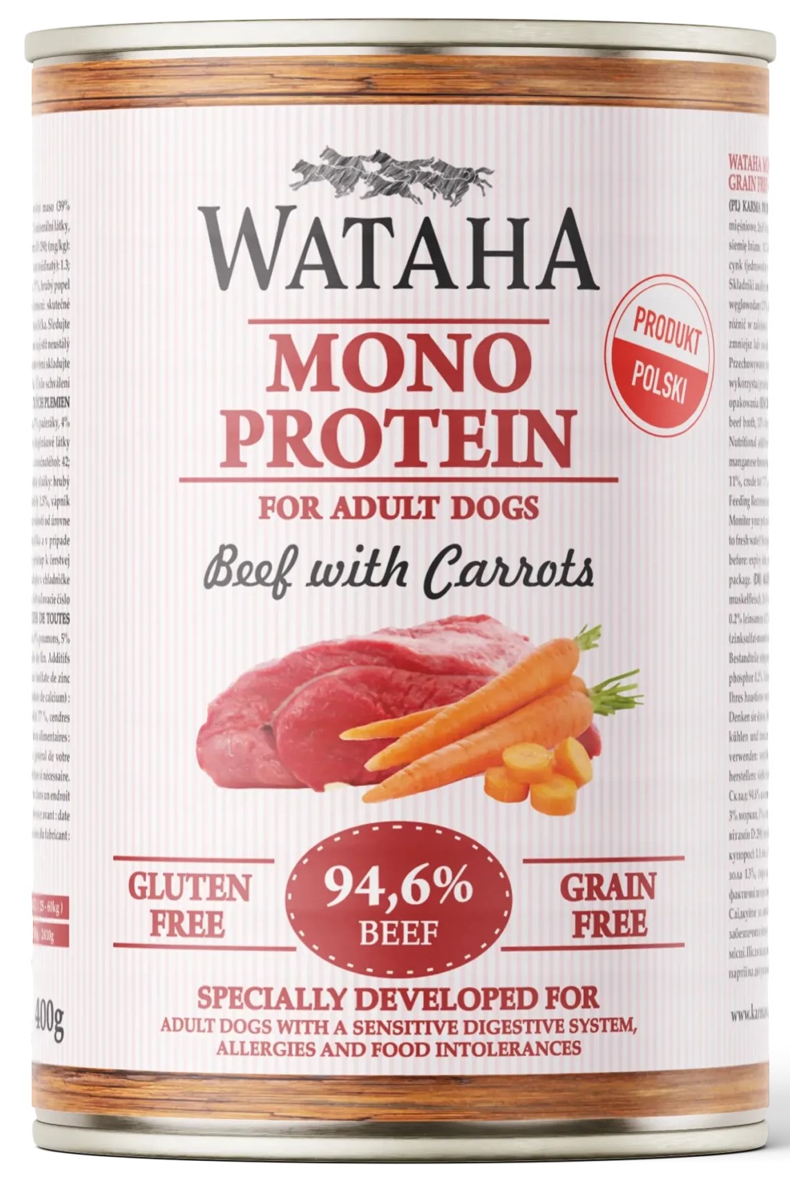 Wataha Mono Wołowina Marchewka to pełnoporcjowa mokra karma przygotowana z myślą o dorosłych psach, szczególnie tych z wrażliwym układem pokarmowym lub skłonnością do alergii pokarmowych. Dzięki prostej recepturze opartej na jednym źródle białka produkt jest dobrze tolerowany i wspiera komfort trawienia. Głównym składnikiem karmy jest wysokiej jakości wołowina, która dostarcza wartościowego białka i aminokwasów potrzebnych do prawidłowego funkcjonowania organizmu psa. Recepturę uzupełniają warzywa – marchewka i seler – które wzbogacają posiłek o witaminy i wspierają prawidłowe trawienie. Karma nie zawiera zbóż, glutenu ani sztucznych dodatków.