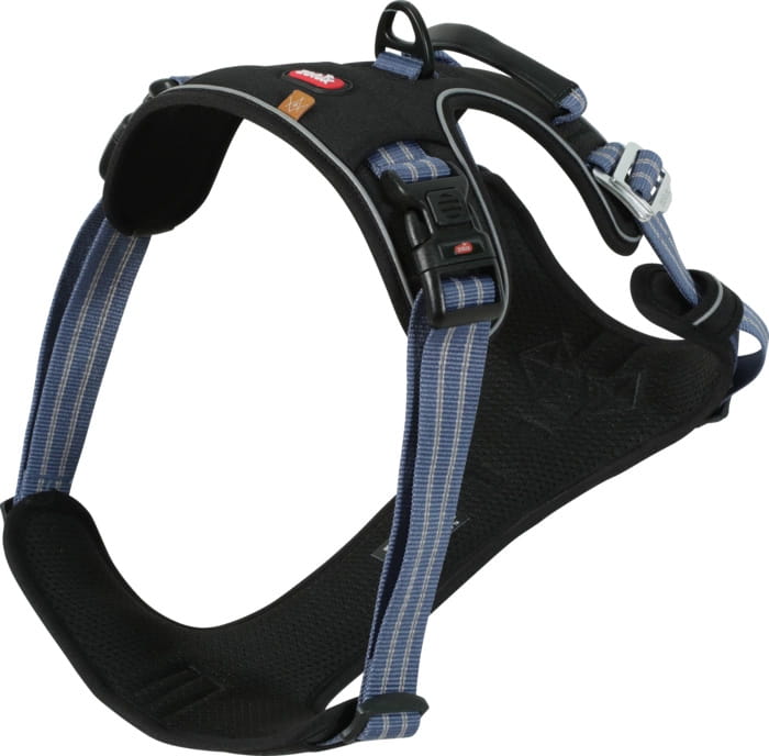 - Dwie plastikowe klamry z dodatkowym zabezpieczeniem oraz metalowa klamra, która pozwala na założenie szelek bez potrzeby przekładania ich przez głowę psa